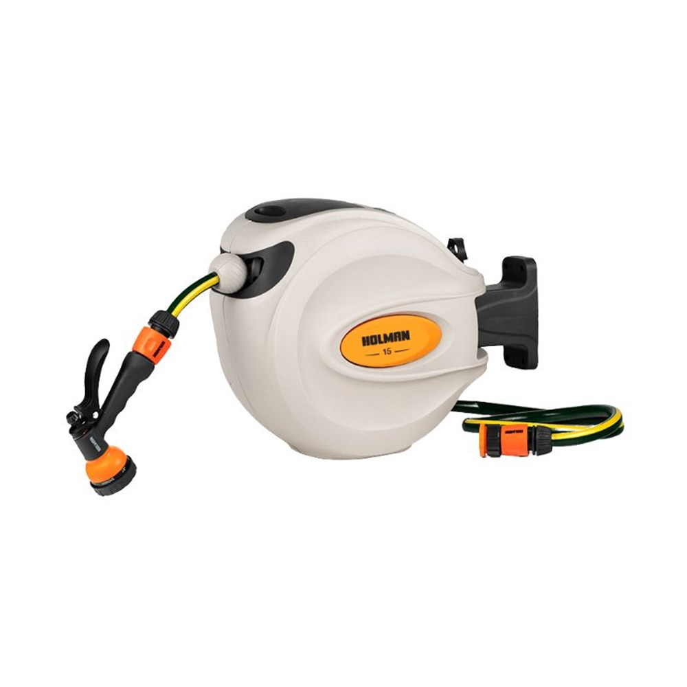 The 15m Hose Reel is ready-for use straight after installation and comes inclusive of a 12mm replaceable garden hose, 7‑function spray gun and all fittings required for mounting.