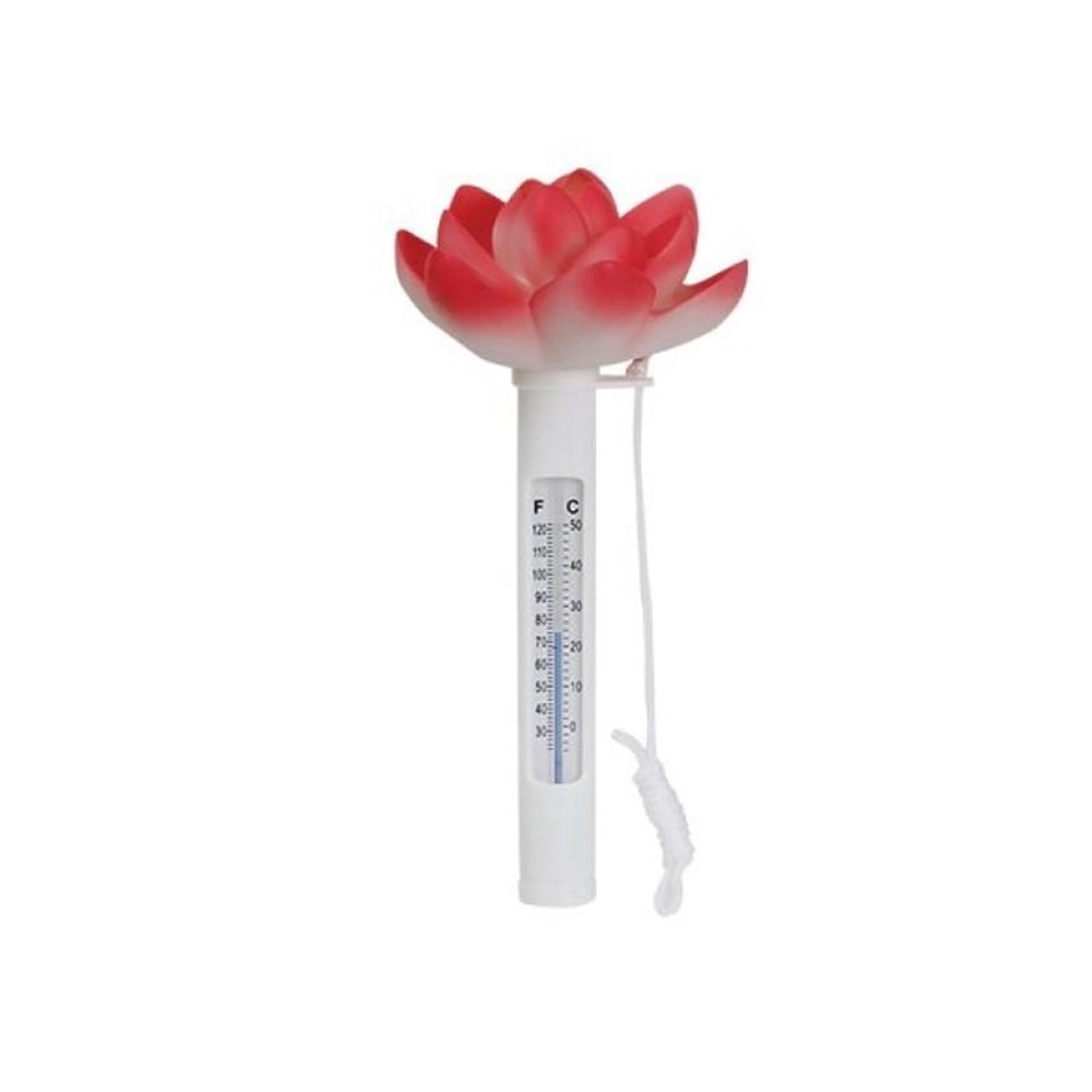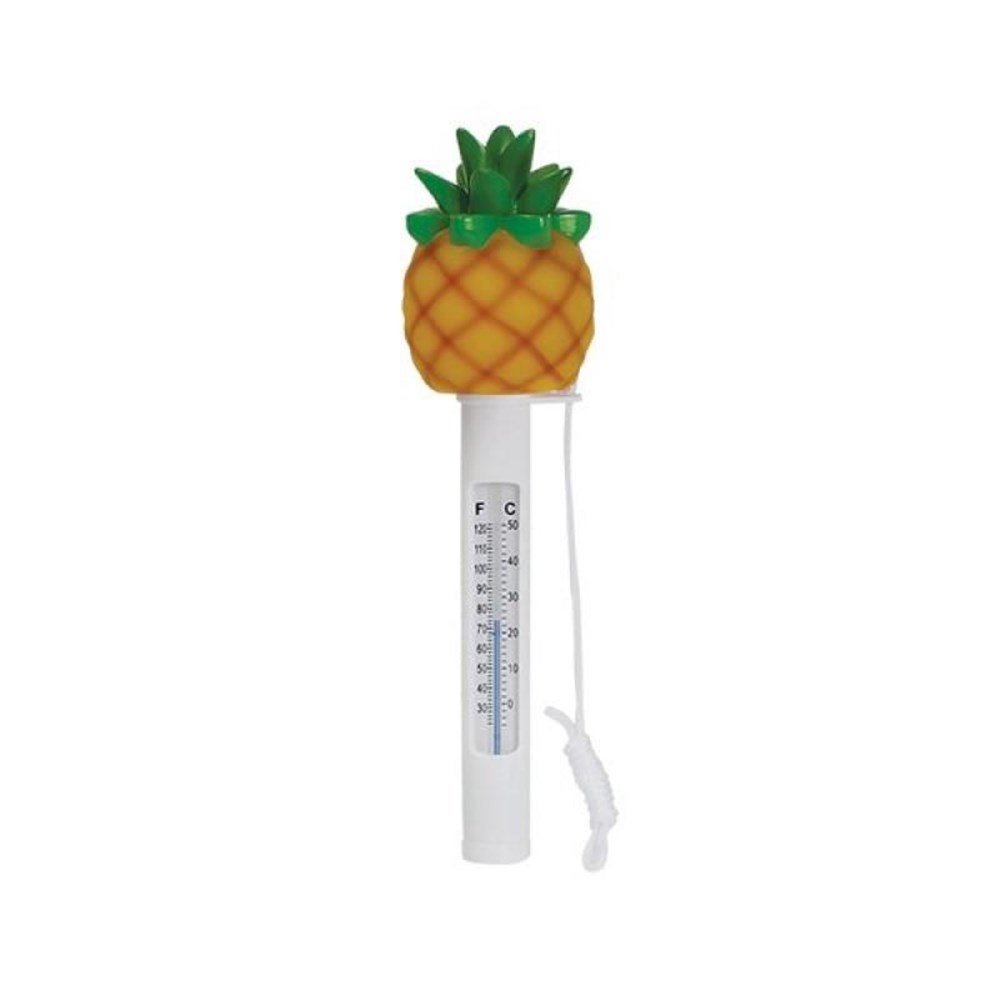A floating thermometer to be used in a spa and pool featuring a brightly coloured plastic figure that floats above the water to be easily seen.
