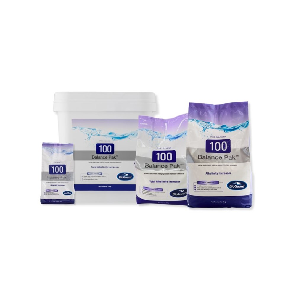 BioGuard Balance Pak 100 is a soluble powder that eliminates pH bounce and raises Total Alkalinity.