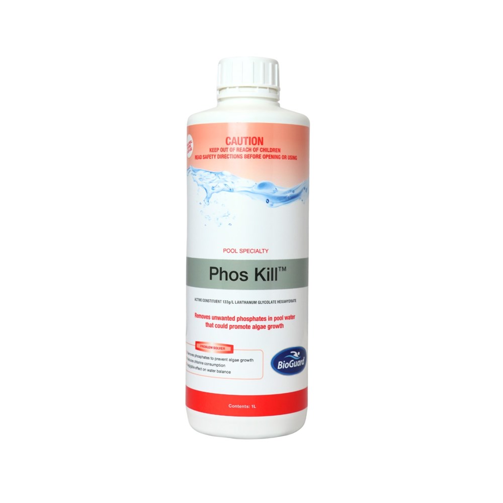 BioGuard Phos Kill will remove phosphates (a major food source for algae) from pool water, preventing algae growth. Using this product makes pool sanitation more efficient against green pools and can reduce chlorine consumption. Product Features: 133g/L Lanthaum Glycolate Hexahydrate Prevents algae growth by removing phosphates, a major food source Negligible effect on water balance Useful for pools exposed to phosphate rich environments, such as swimming pets, birds, heavy rain, garden beds, floods, dust storms, areas with many trees, country areas. Benefits: Promotes healthy, sparkling pool water for safe swimming conditions Saves money by reducing chlorine consumption Pool sanitisation becomes more efficient against green pools Can be used as maintenance, preventative or problem solver Storage and transport friendly