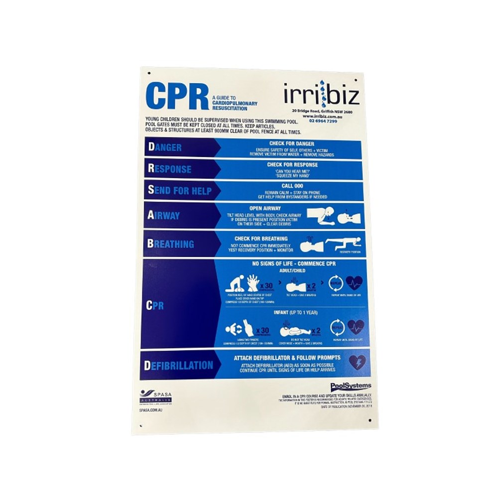 CPR Resuscitation Chart: Size: 412mm x 635mm. Made from durable UV resistant PVC material. Compliant with Australian Standards.
